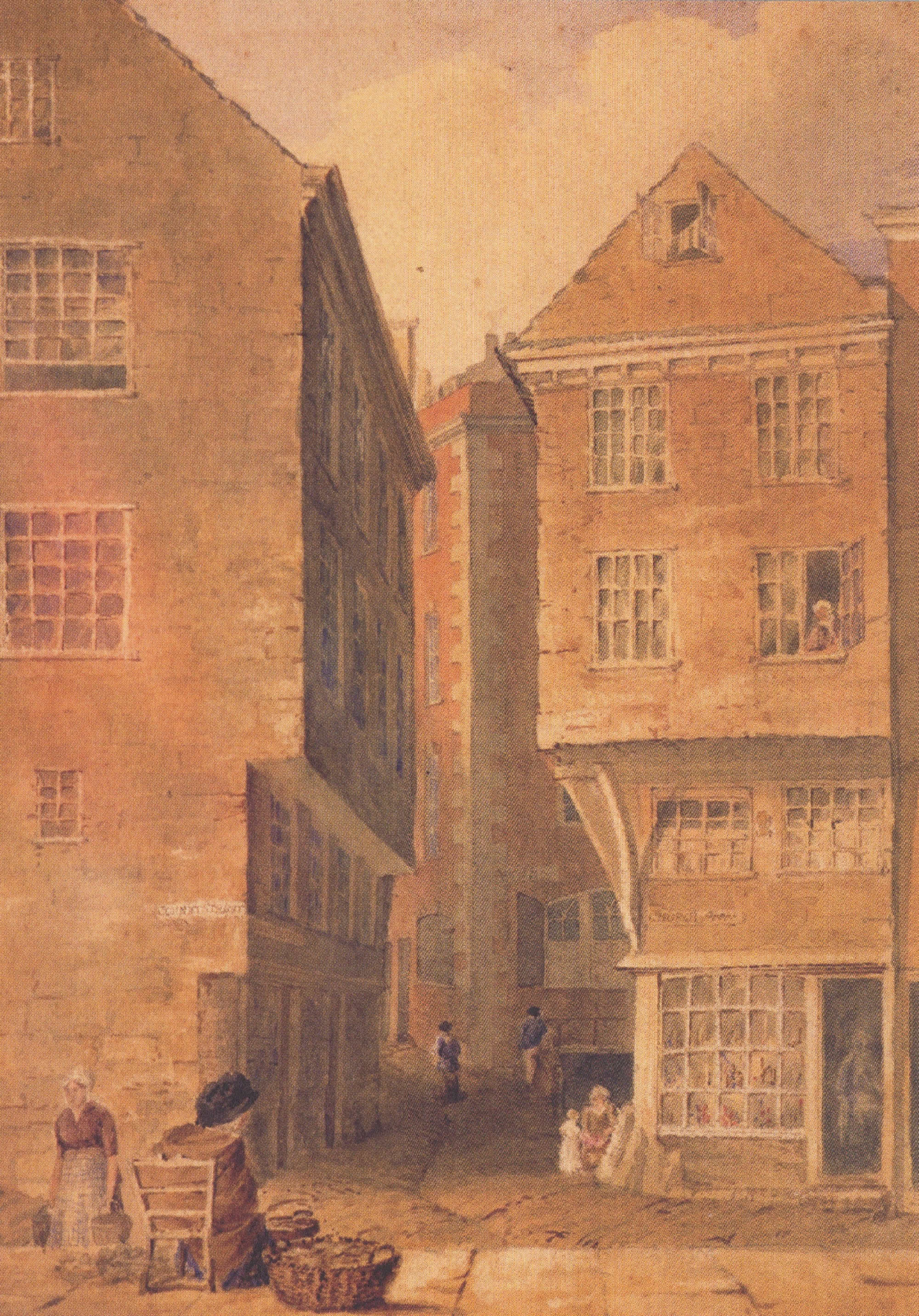 The Quay, St Peter Port, circa 1800. The harbourside was crowded with taverns. This watercolour shows the archway that led to Cow Lane and the High Street, to the area where meat was offered for sale.
